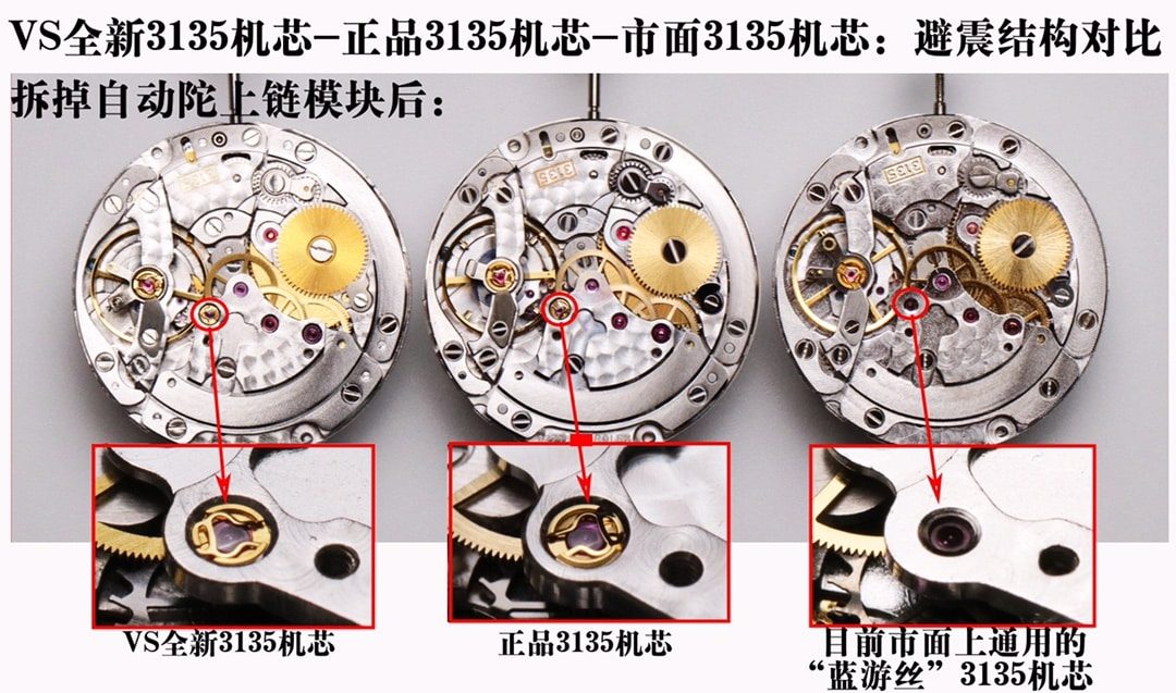 劳力士这些高端机芯的稳定性之所以那么牛逼,就是有很多让人赞叹的设计细节,例如在关键位置使用避震器,可以避免摔坏等质量问题。VS全新3135机芯投入成本,装入跟正品一样的避震器。市面3135机芯只装了一个普通宝石,外观跟正品完全不同机芯的稳定性和抗摔性会比正品和VS差很多。
