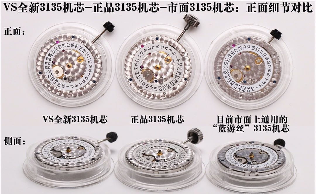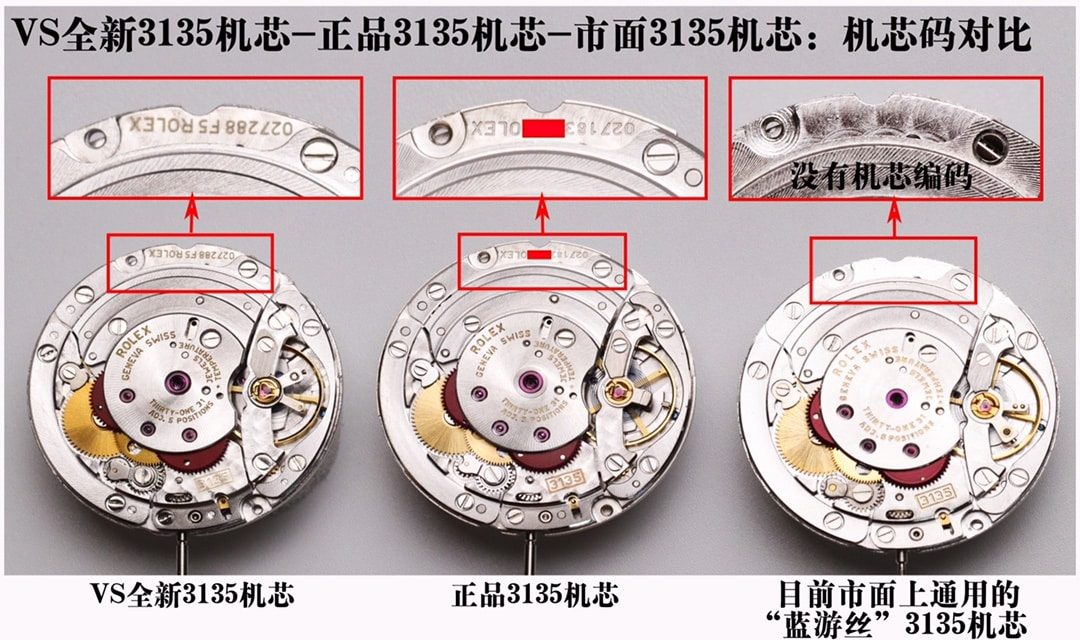 VS全新3135机芯跟正品3135机芯一样,机芯板上刻有机芯码+ROLEX。