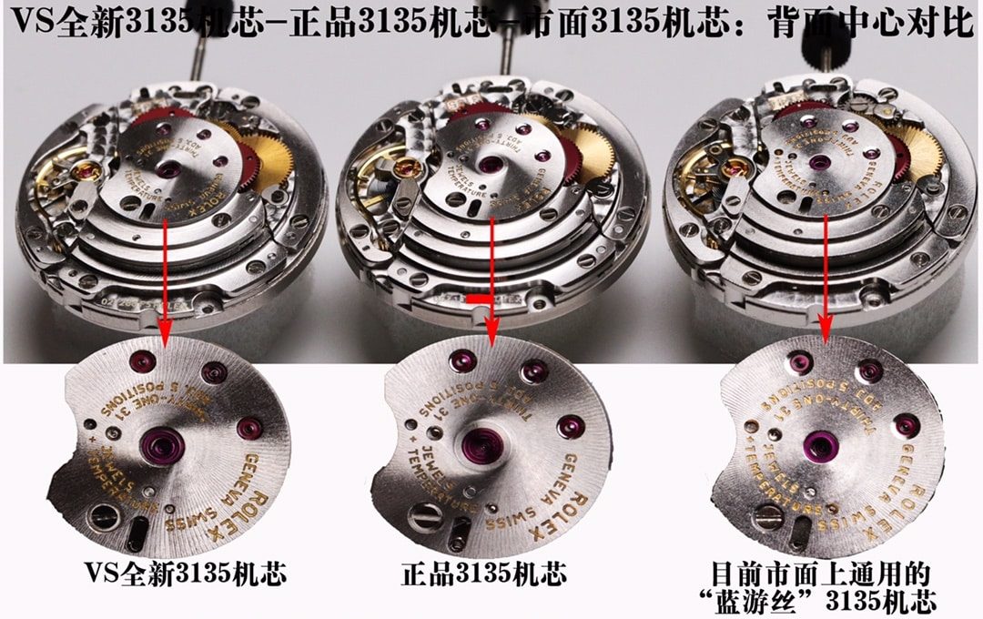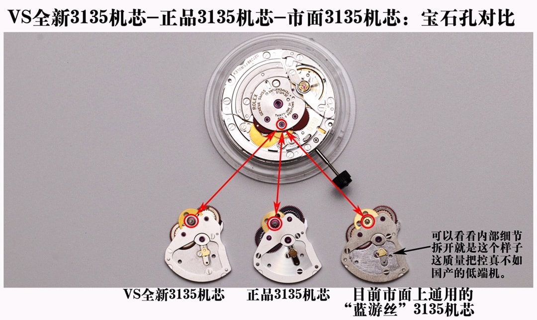 正品3135机芯,宝石孔是有上下两颗红宝石固定传动轴,VS全新3135机芯宝石孔也是有两颗红宝石固定。市面上的3135机芯,只有看的见的那一颗红宝石,导致传动轴可晃动的幅度大,就会造成机芯不稳定等质量问题。