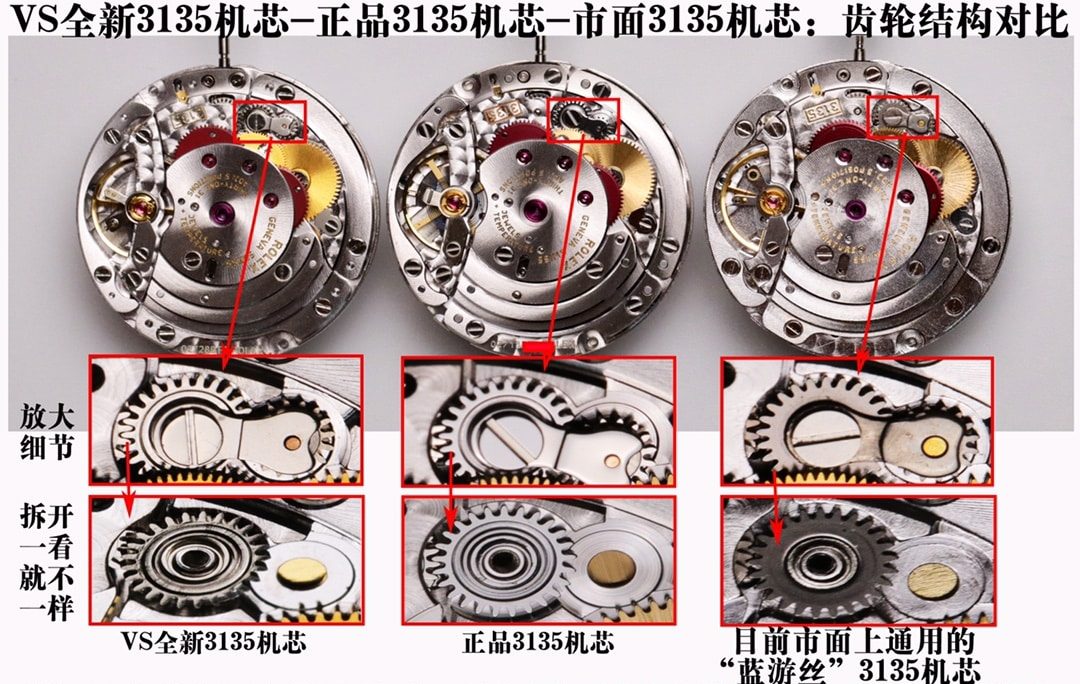 正品3135机芯和VS全新3135机芯:摇片上的两个齿轮都是立体有台阶的,更紧凑市面上的3135机芯只是两个普通平片齿轮,没有台阶,会降低机芯质量和稳定性。