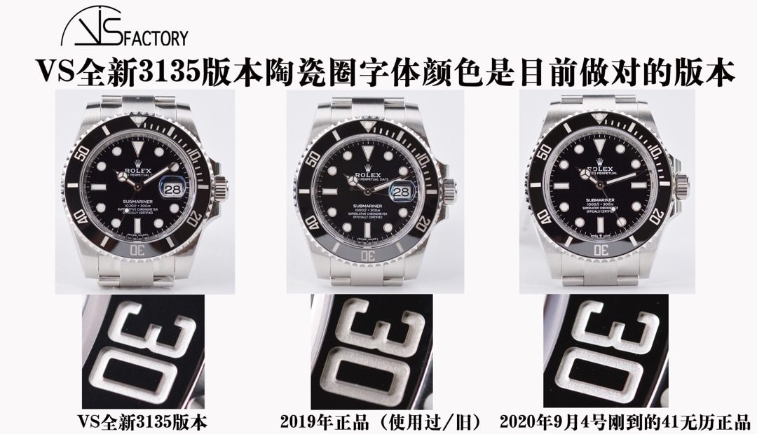 因为有些玩家拿的是全新正品,有些拿的是使用过/旧的正品进行对比,不同的标准就得出不同的结论。市面上的版本都是使用过/旧的正品去工厂生产,所以字体都做成银灰色,时间长就显得发黑。VS陶瓷圈字体颜色是目前做对的版本。大家可以参考最新41mm正品的颜色。