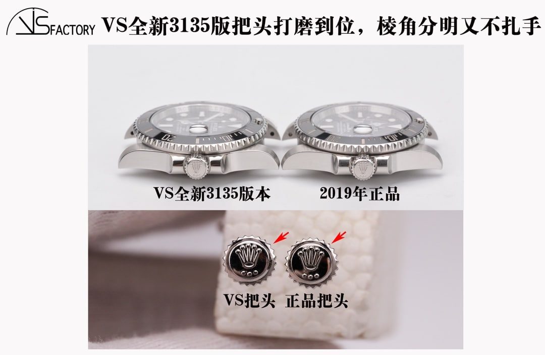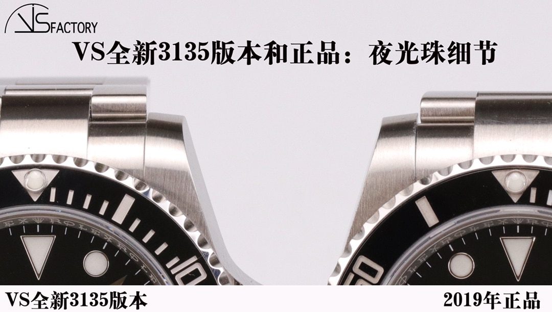 VS全新3135和正品摆在一起拍“夜光珠”的细节,这样的质感您满意吗?VS在RXF版本的基础上再提升,整体的颜色、质感更好,还原出正品夜光珠的晶莹剔透感。夜光珠上的一层小透明是一片蓝宝石玻璃噢。