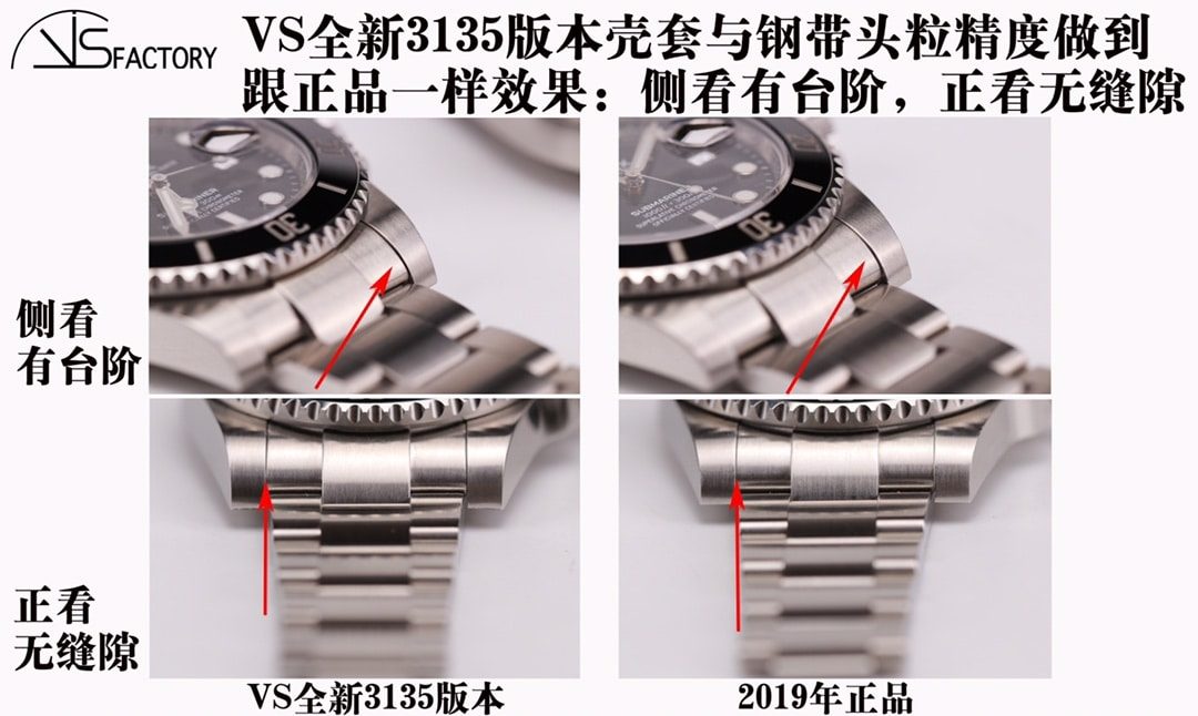市面上很多版本壳套的4个耳位与钢带头粒经常高低不平,甚至头粒高出壳套耳位,有些还能看到很大一条见光缝隙。VS壳套做到:侧看有台阶,而且是4个耳位都是一样的台阶效果,正看无缝隙。做好您所关心的细节