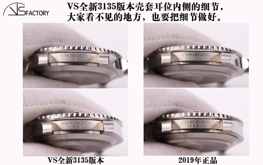 壳套耳位内侧这个位置,因为被钢带挡住了,这是大家平时看不见的地方,VS版本也很用心把这个细节做好。拉竖砂纹,再刻字。做好每个细节。