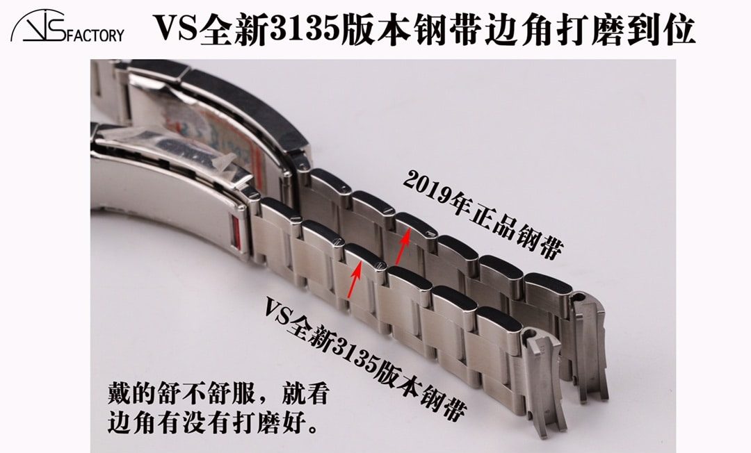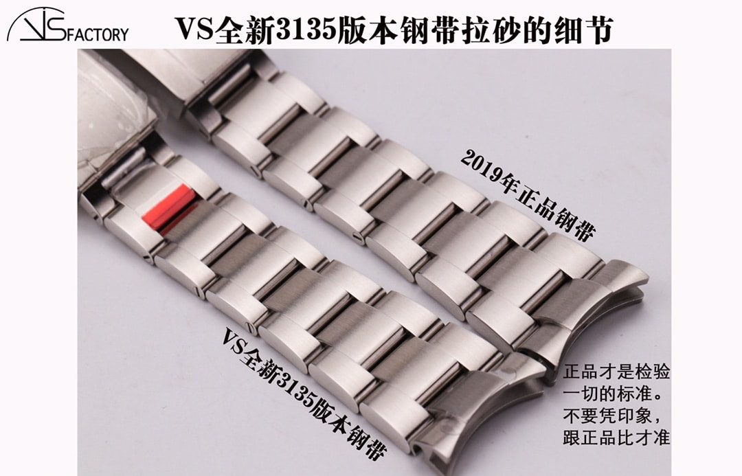 钢带带面拉砂细节的好坏会影响整表的质感。VS版本的钢带,通过采用进口砂纸增加拉砂的次数等方法,把拉砂纹处理得更接近正品质感,清晰、细腻、完整。